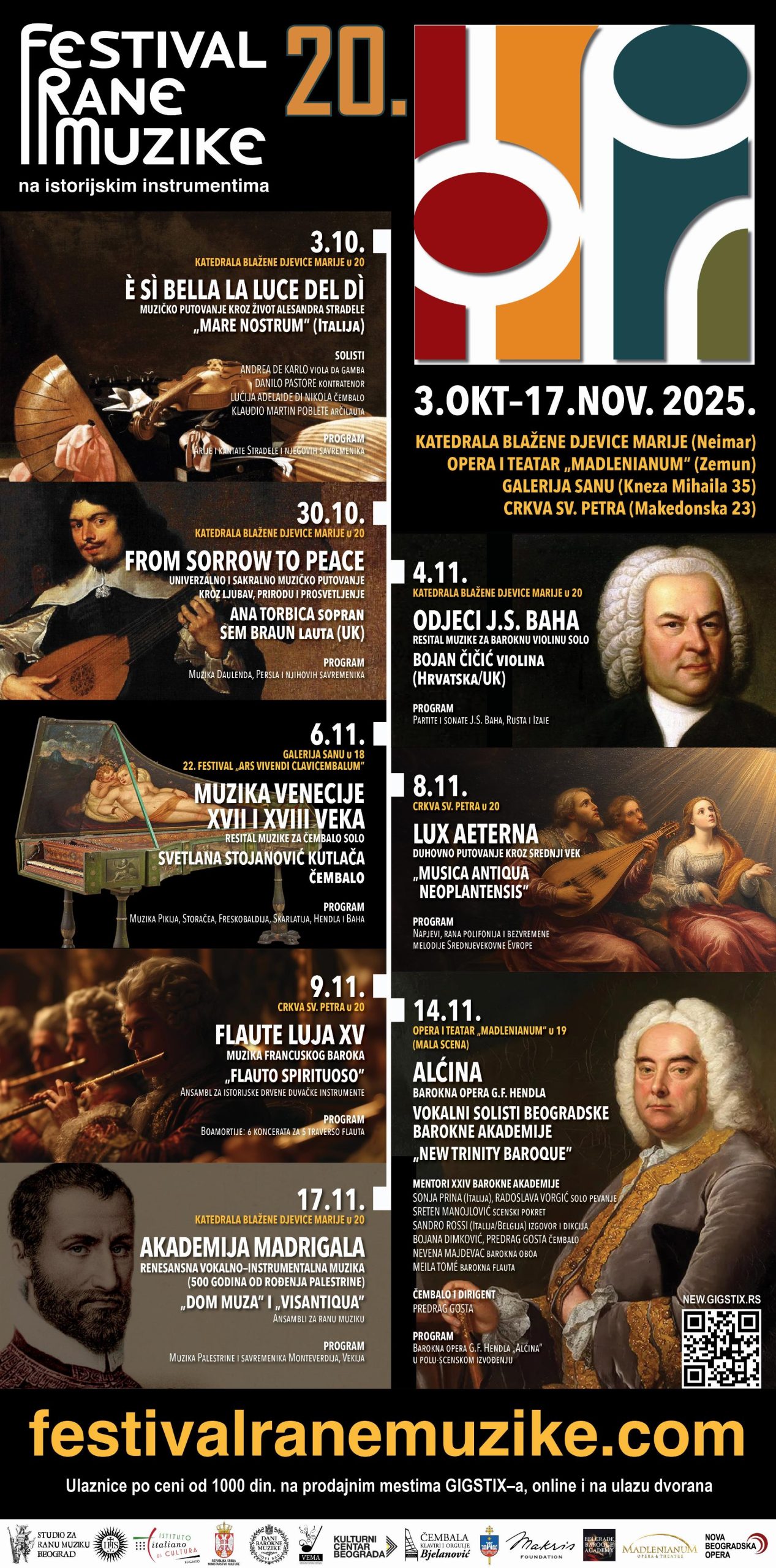A inaugurare la XX edizione del Festival di musica antica di Belgrado, fondato nel 1991 e dedicato all’esecuzione della musica medievale, rinascimentale, barocca e classica con strumenti d’epoca, sarà il concerto “È sì bella la luce del dì – Percorsi musicali nella vita di Alessandro Stradella” dell’Ensemble Mare Nostrum diretto dal Maestro Andrea De Carlo. Il concerto, organizzato in collaborazione con l’Istituto Italiano di Cultura di Belgrado, avrà luogo venerdì 3 ottobre alle ore 20.00 presso la Cattedrale della Beata Vergine Maria a Belgrado.